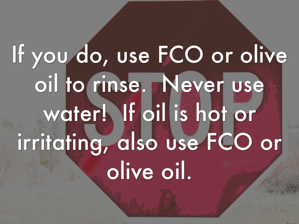 If you do, use FCO or olive oil to rinse. Never use water! If oil is hot or irritating, also use FCO or olive oil.