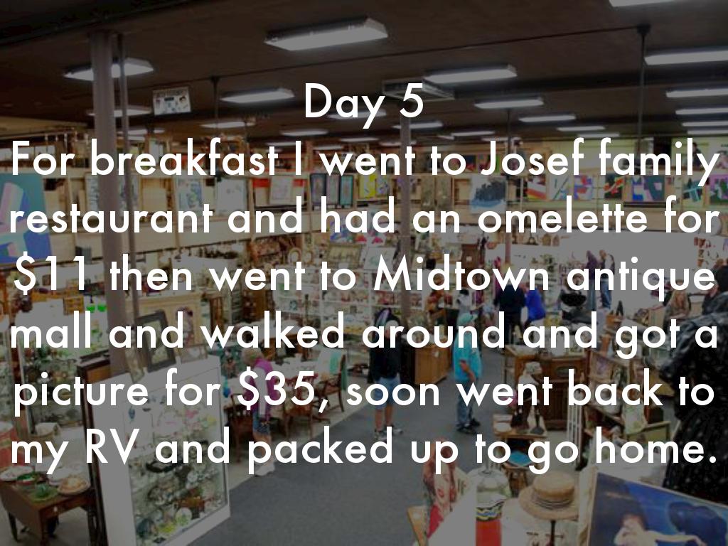 For breakfast I went to Josef family restaurant and had an omelette for $11 then went to Midtown antique mall and walked around and got a picture for $35, soon went back to my RV and packed up to go home.