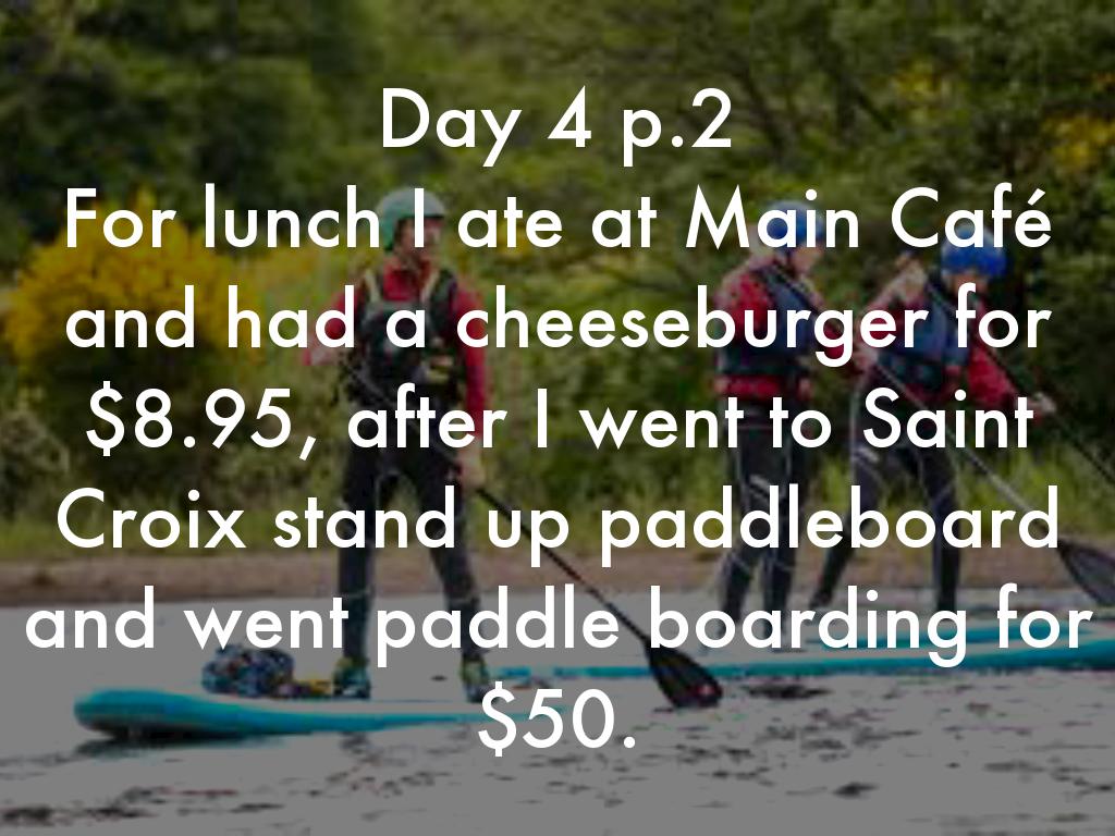 For lunch I ate at Main Café and had a cheeseburger for $8.95, after I went to Saint Croix stand up paddleboard and went paddle boarding for $50.