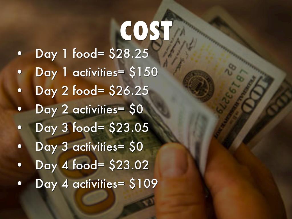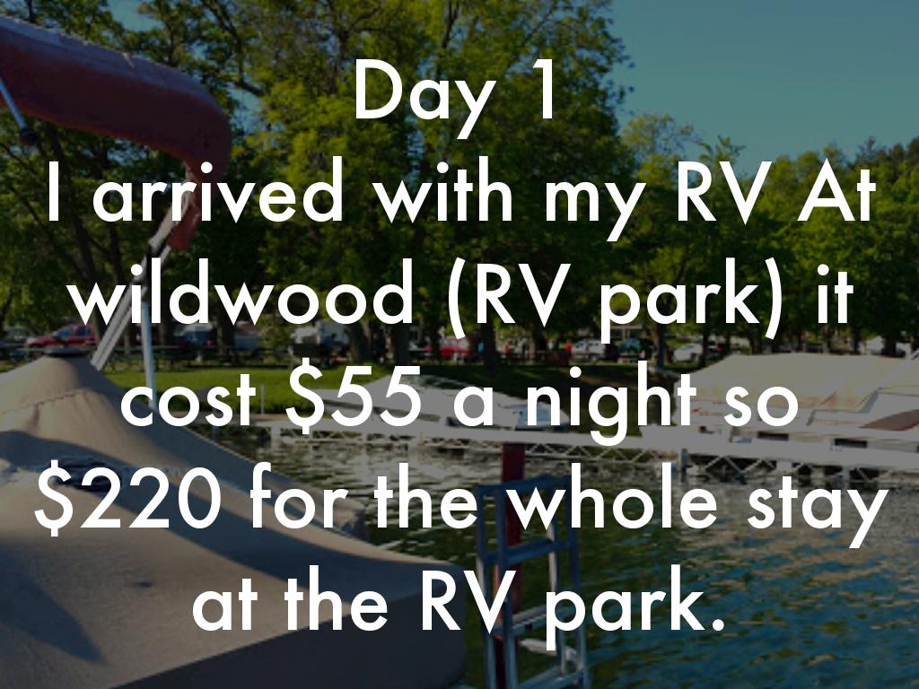 I arrived with my RV At wildwood (RV park) it cost $55 a night so $220 for the whole stay at the RV park.
