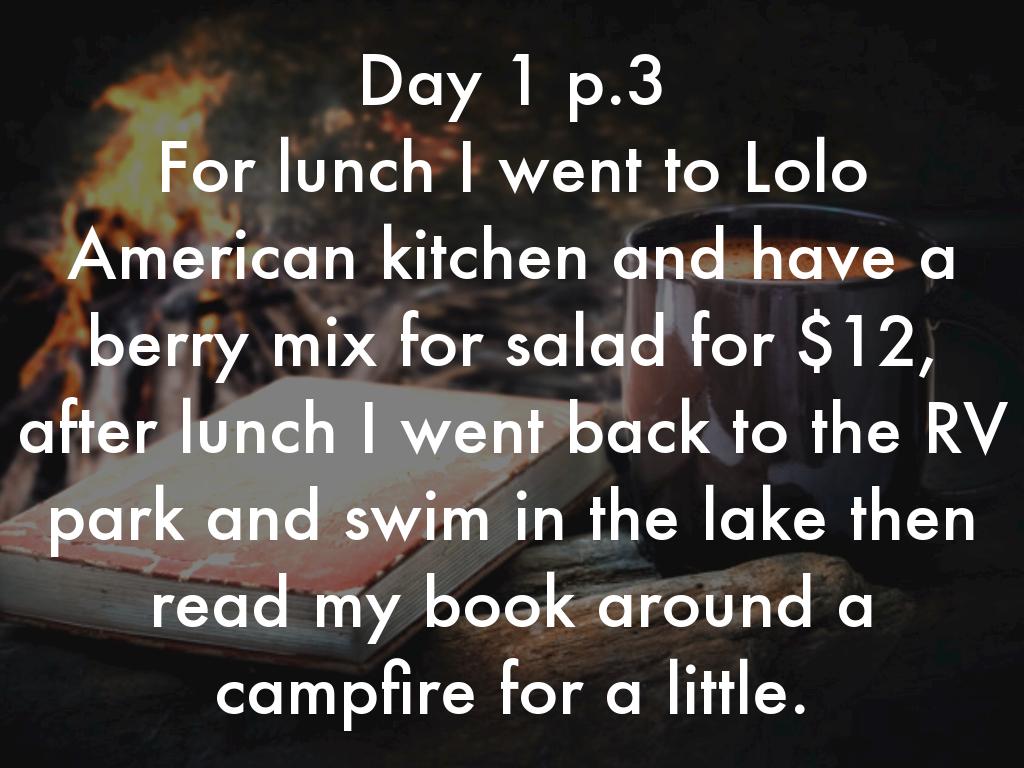 For lunch I went to Lolo American kitchen and have a berry mix for salad for $12, after lunch I went back to the RV park and swim in the lake then read my book around a campfire for a little.