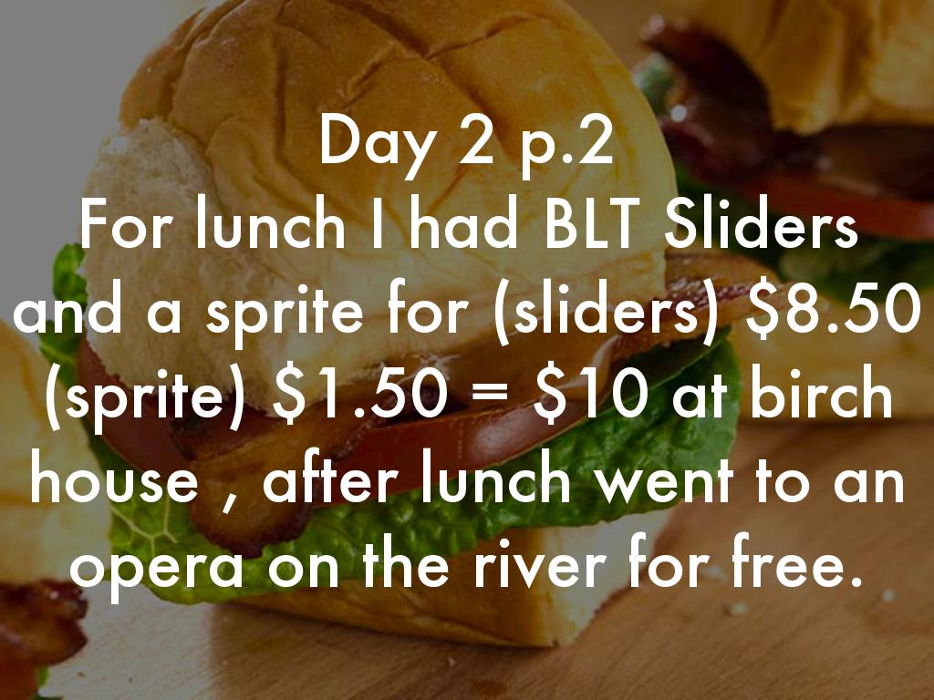 For lunch I had BLT Sliders and a sprite for (sliders) $8.50 (sprite) $1.50 = $10 at birch house , after lunch went to an opera on the river for free.