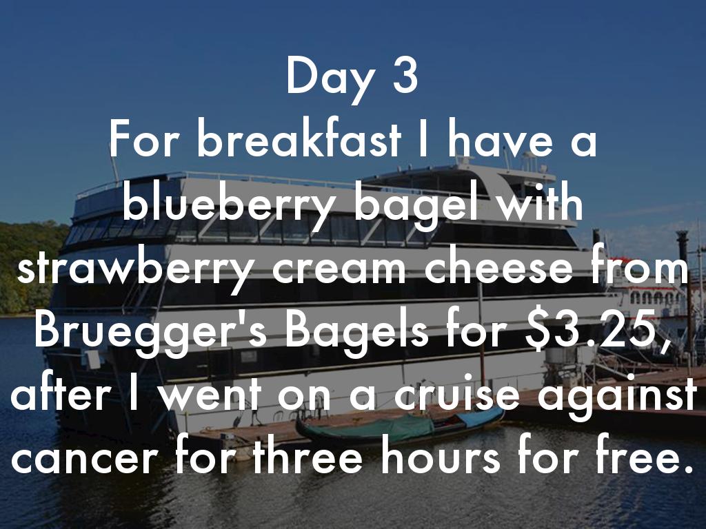 For breakfast I have a blueberry bagel with strawberry cream cheese from Bruegger's Bagels for $3.25, after I went on a cruise against cancer for three hours for free.
