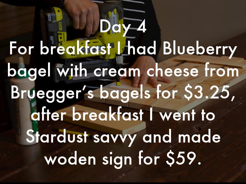 For breakfast I had Blueberry bagel with cream cheese from Bruegger’s bagels for $3.25, after breakfast I went to Stardust savvy and made woden sign for $59.