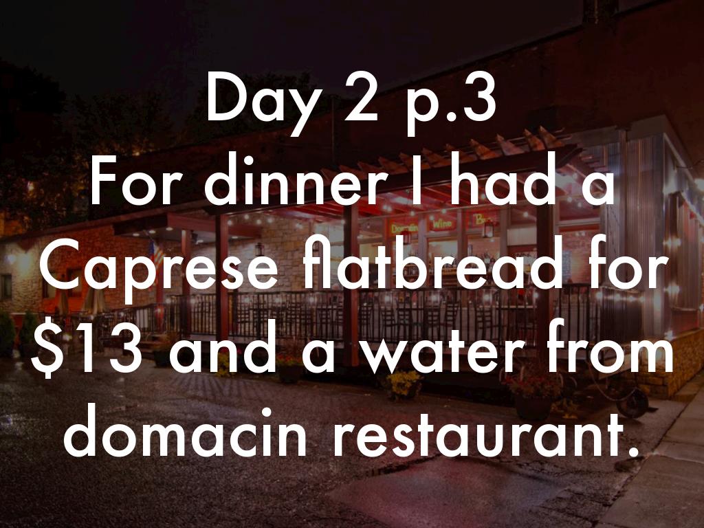 For dinner I had a Caprese flatbread for $13 and a water from domacin restaurant.