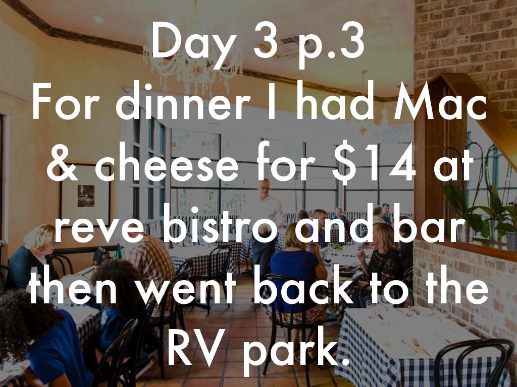 For dinner I had Mac & cheese for $14 at reve bistro and bar then went back to the RV park.