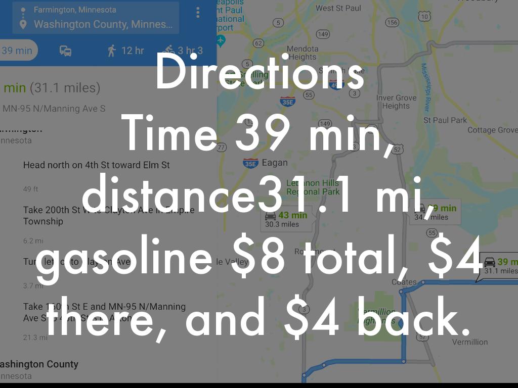 Time 39 min, distance31.1 mi, gasoline $8 total, $4 there, and $4 back.