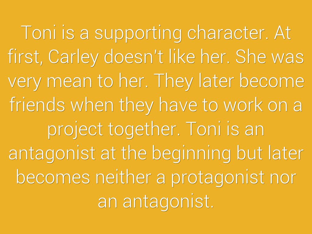 Toni is a supporting character. At first, Carley doesn't like her. She was very mean to her. They later become friends when they have to work on a project together. Toni is an antagonist at the beginning but later becomes neither a protagonist nor an antagonist.