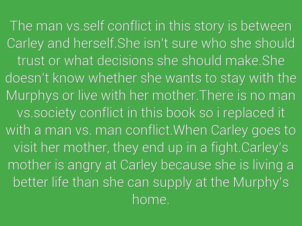 The man vs.self conflict in this story is between Carley and herself.She isn't sure who she should trust or what decisions she should make.She doesn't know whether she wants to stay with the Murphys or live with her mother.There is no man vs.society conflict in this book so i replaced it with a man vs. man conflict.When Carley goes to visit her mother, they end up in a fight.Carley's mother is angry at Carley because she is living a better life than she can supply at the Murphy's home.