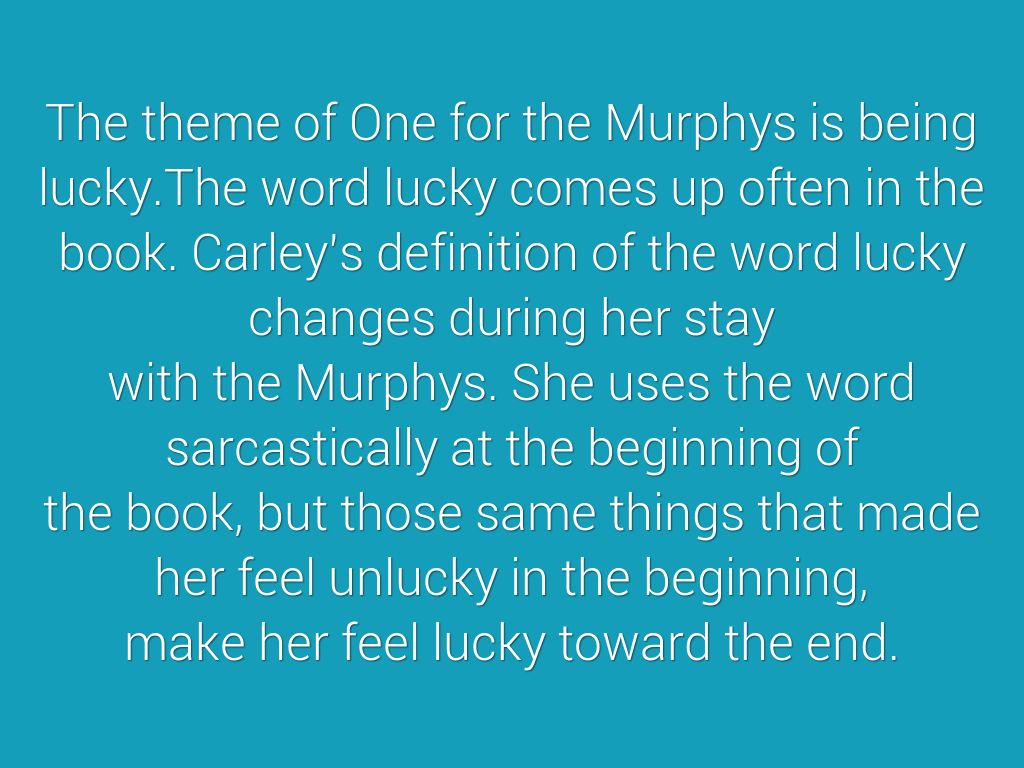 The theme of One for the Murphys is being lucky.The word lucky comes up often in the book. Carley’s definition of the word lucky changes during her stay