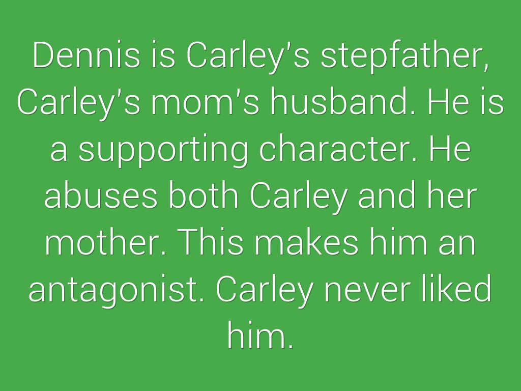 Dennis is Carley's stepfather, Carley's mom's husband. He is a supporting character. He abuses both Carley and her mother. This makes him an antagonist. Carley never liked him.