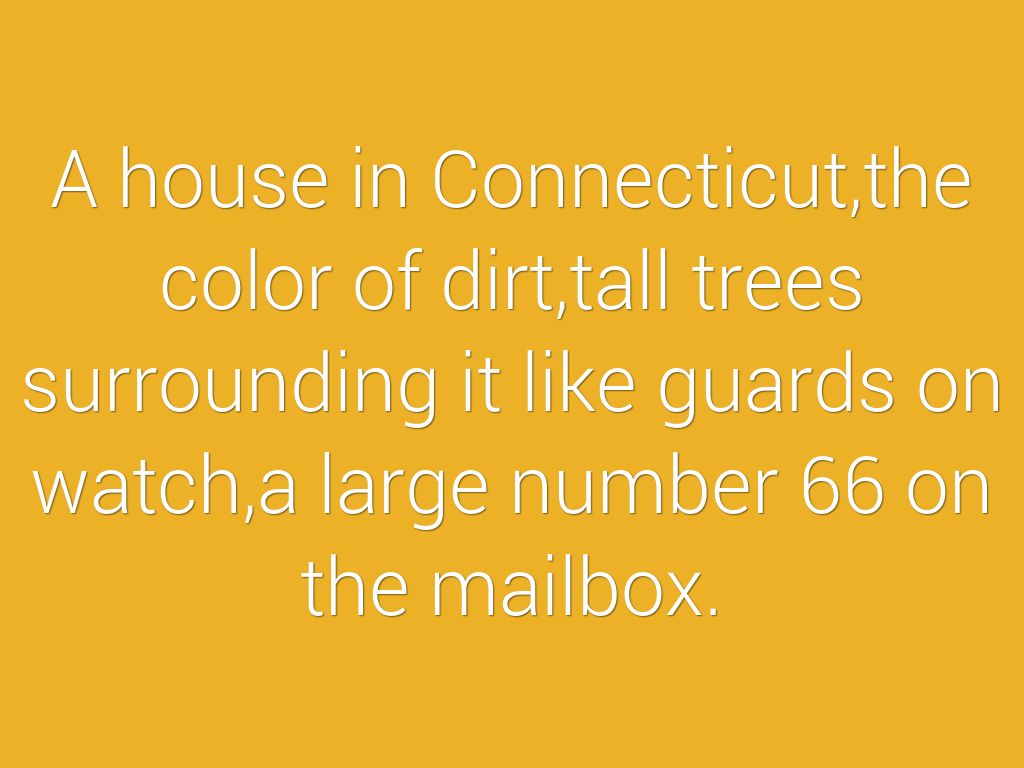 A house in Connecticut,the color of dirt,tall trees surrounding it like guards on watch,a large number 66 on the mailbox.