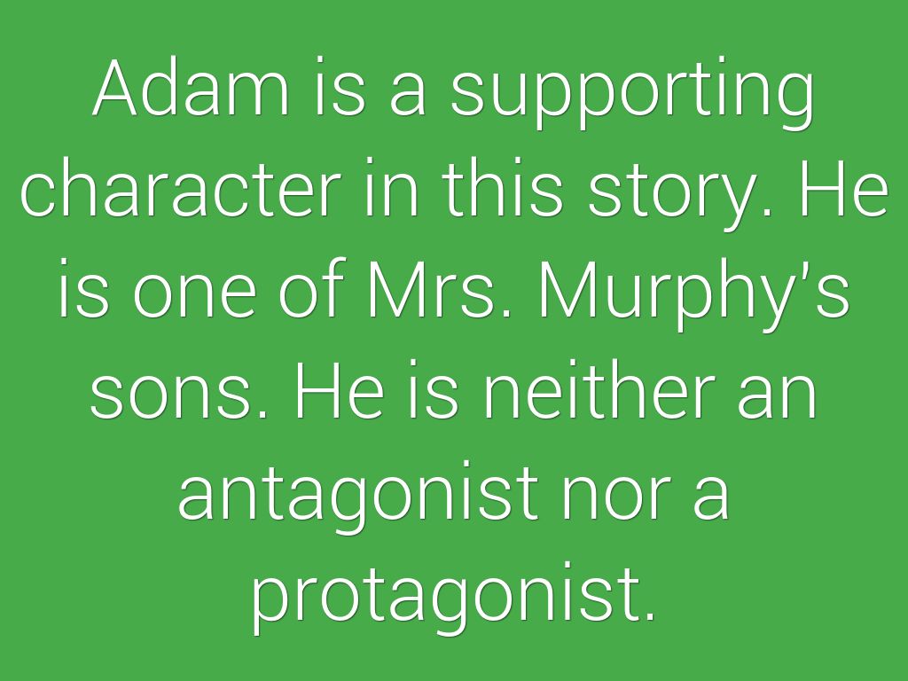 Adam is a supporting character in this story. He is one of Mrs. Murphy's sons. He is neither an antagonist nor a protagonist.