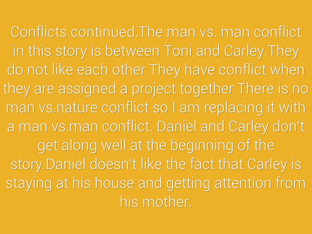 Conflicts continued.The man vs. man conflict in this story is between Toni and Carley.They do not like each other.They have conflict when they are assigned a project together.There is no man vs.nature conflict so I am replacing it with a man vs.man conflict. Daniel and Carley don't get along well at the beginning of the story.Daniel doesn't like the fact that Carley is staying at his house and getting attention from his mother.