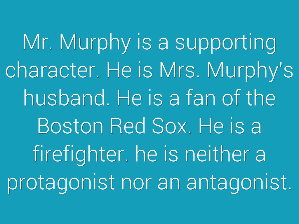Mr. Murphy is a supporting character. He is Mrs. Murphy's husband. He is a fan of the Boston Red Sox. He is a firefighter. he is neither a protagonist nor an antagonist.