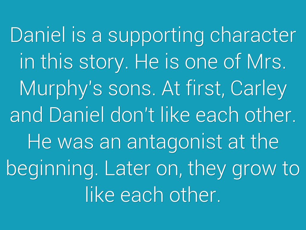 Daniel is a supporting character in this story. He is one of Mrs. Murphy's sons. At first, Carley and Daniel don't like each other. He was an antagonist at the beginning. Later on, they grow to like each other.