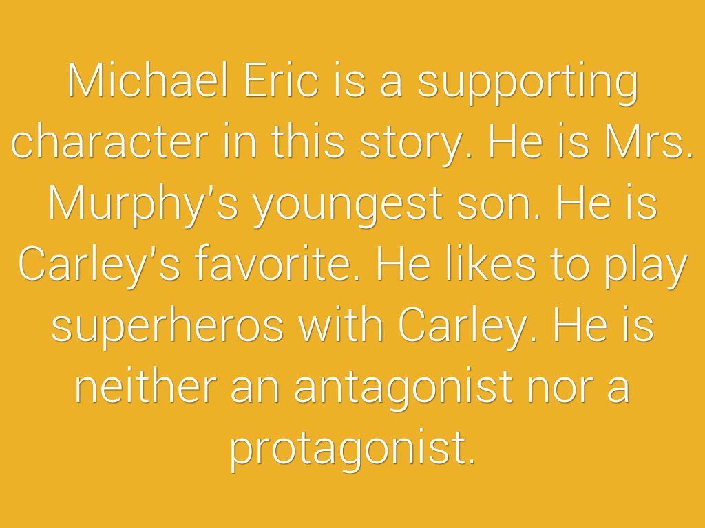 Michael Eric is a supporting character in this story. He is Mrs. Murphy's youngest son. He is Carley's favorite. He likes to play superheros with Carley. He is neither an antagonist nor a protagonist.