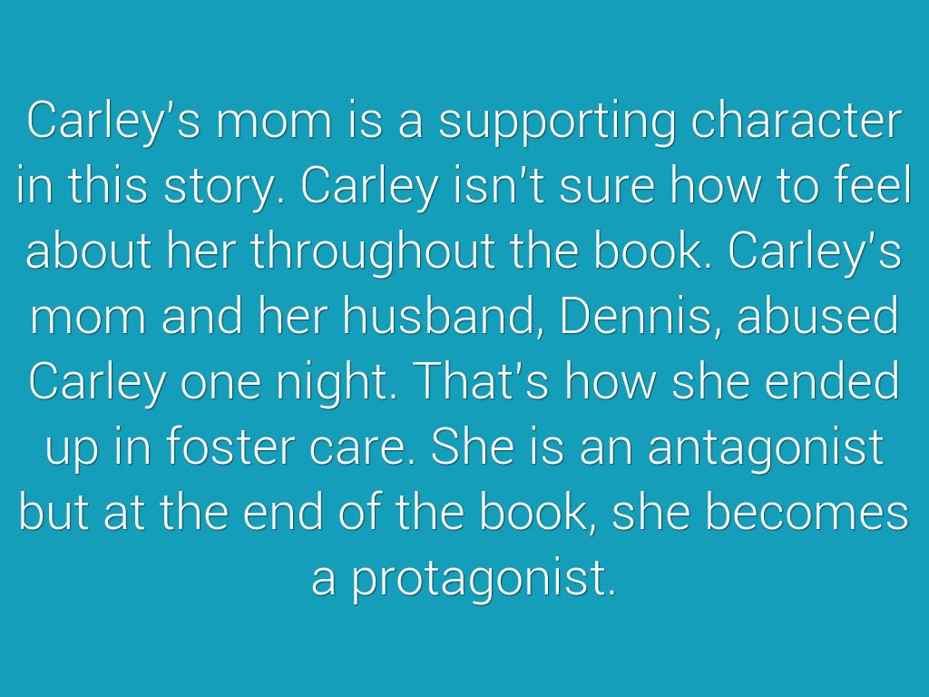 Carley's mom is a supporting character in this story. Carley isn't sure how to feel about her throughout the book. Carley's mom and her husband, Dennis, abused Carley one night. That's how she ended up in foster care. She is an antagonist but at the end of the book, she becomes a protagonist.