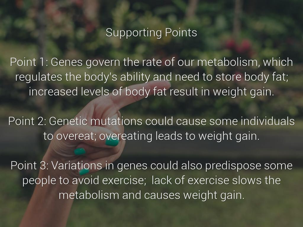 Point 1: Genes govern the rate of our metabolism, which regulates the body’s ability and need to store body fat; increased levels of body fat result in weight gain.