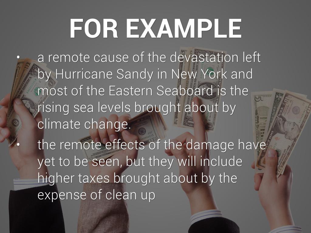 In 2012, Hurricane Sandy (the immediate cause) bludgeoned New York City and its environs with its winds and sea surge, destroying thousands of homes and businesses and more than 200,000 vehicles (the immediate effect).