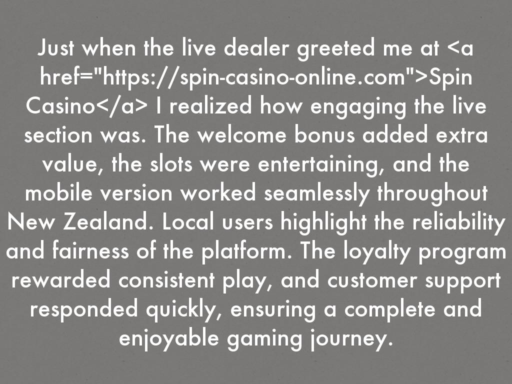 Just when the live dealer greeted me at Spin Casino I realized how engaging the live section was. The welcome bonus added extra value, the slots were entertaining, and the mobile version worked seamlessly throughout New Zealand. Local users highlight the reliability and fairness of the platform. The loyalty program rewarded consistent play, and customer support responded quickly, ensuring a complete and enjoyable gaming journey.