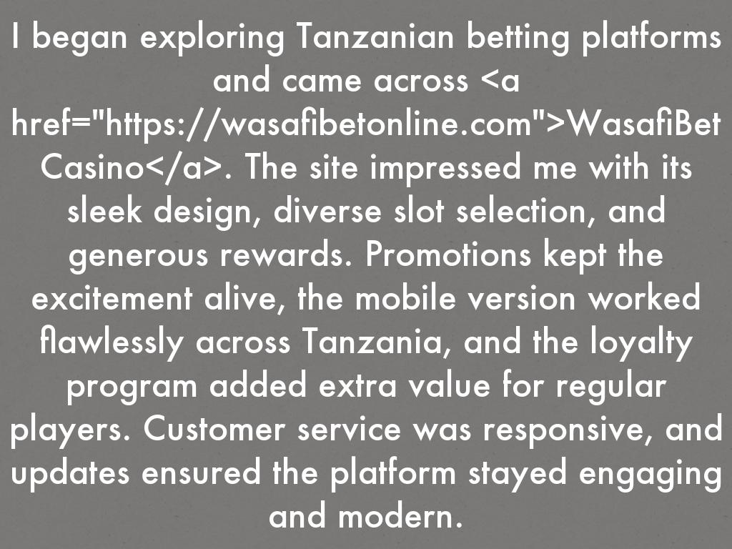 I began exploring Tanzanian betting platforms and came across WasafiBet Casino. The site impressed me with its sleek design, diverse slot selection, and generous rewards. Promotions kept the excitement alive, the mobile version worked flawlessly across Tanzania, and the loyalty program added extra value for regular players. Customer service was responsive, and updates ensured the platform stayed engaging and modern.