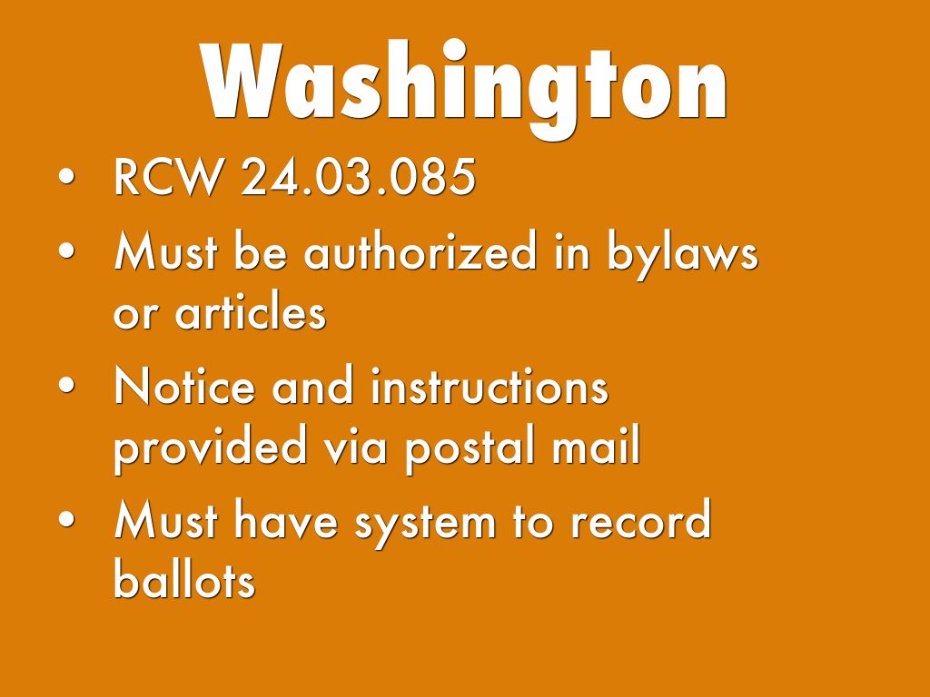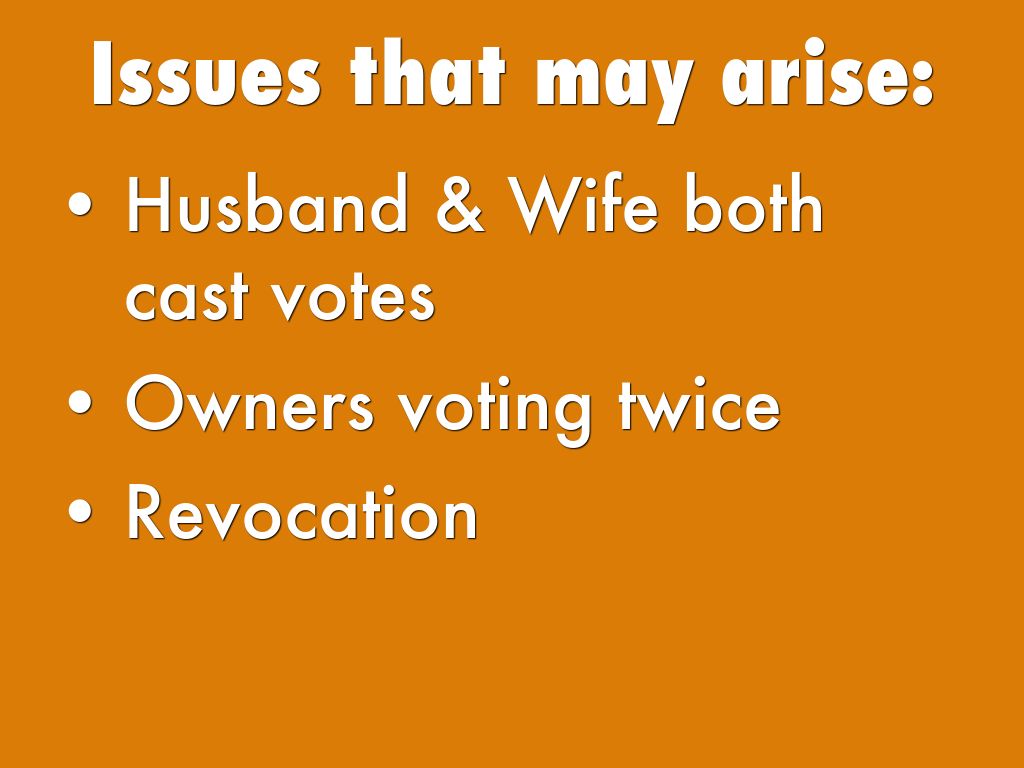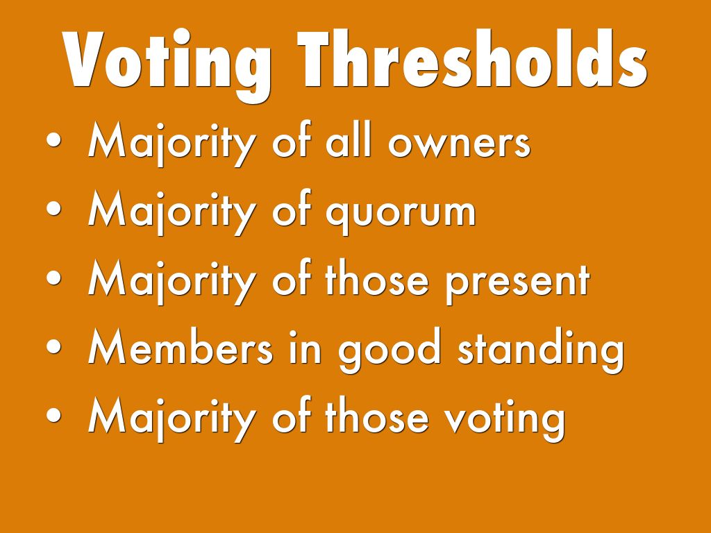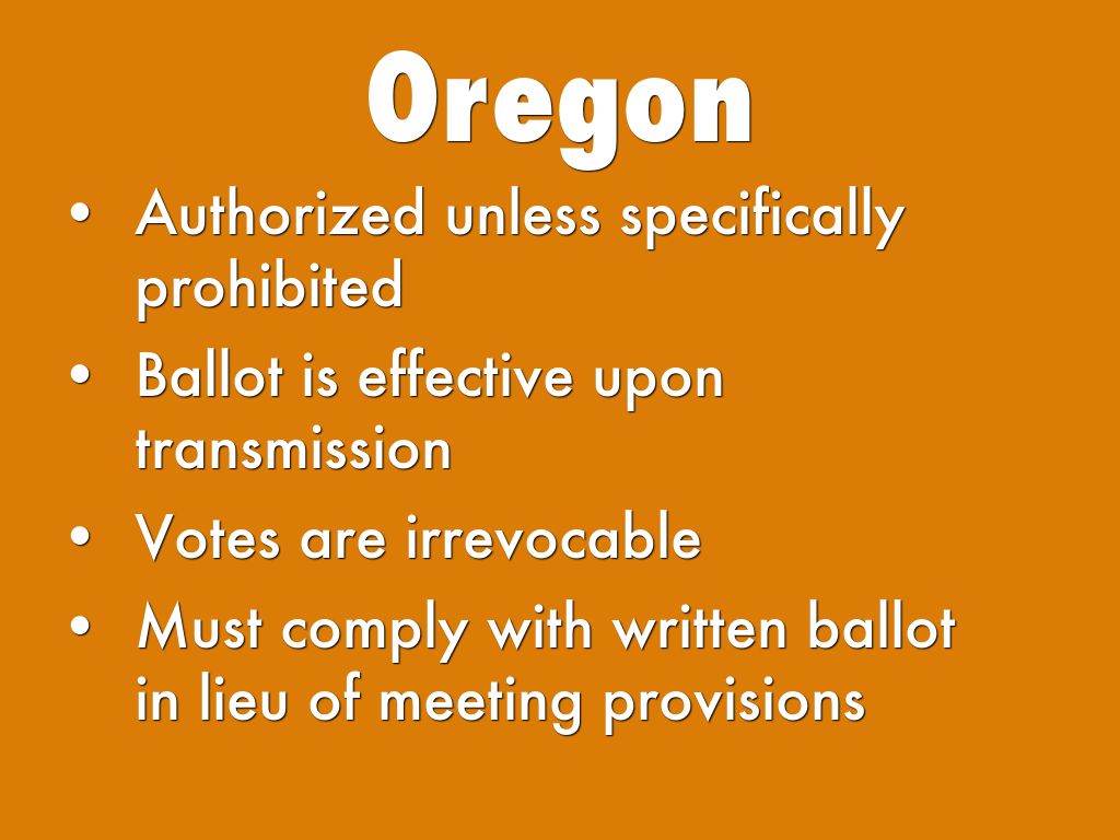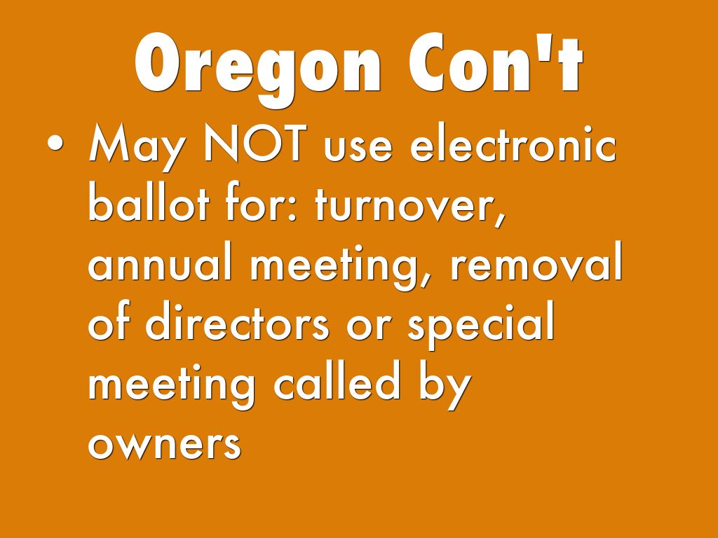 • May NOT use electronic ballot for: turnover, annual meeting, removal of directors or special meeting called by owners