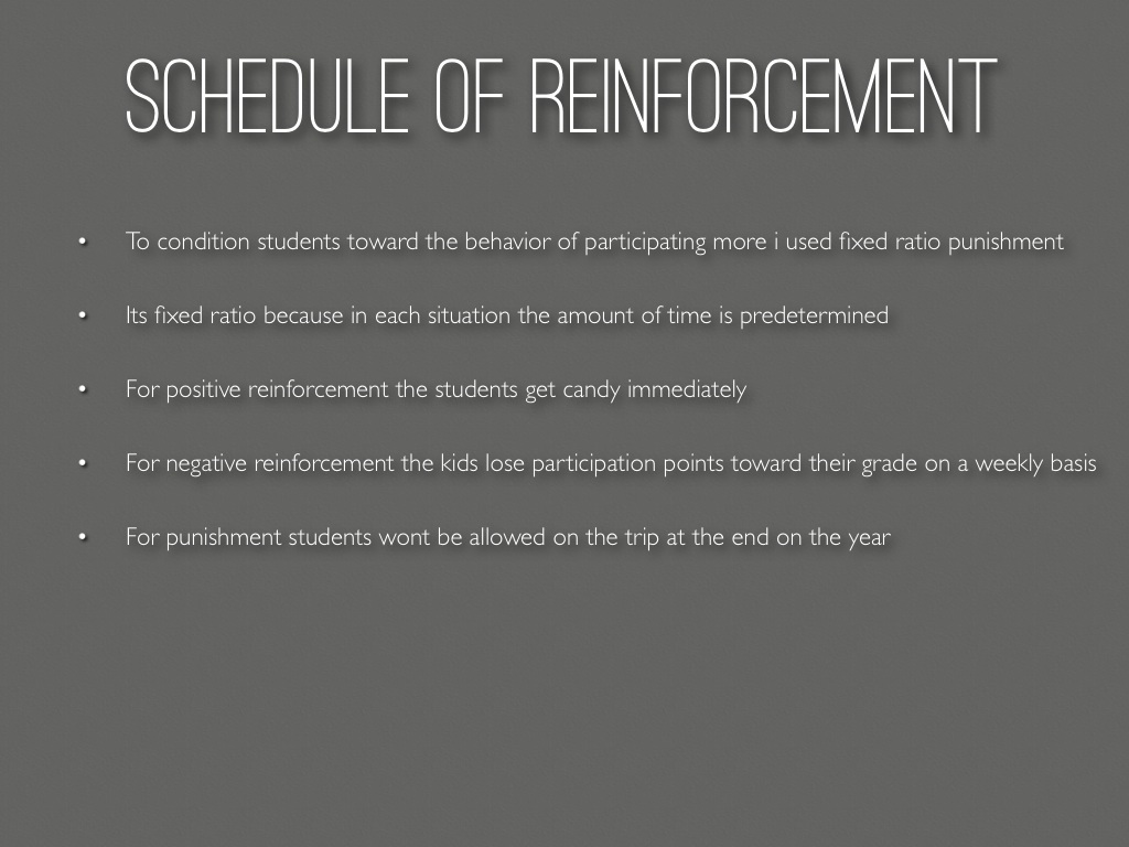 To condition students toward the behavior of participating more i used fixed ratio punishment