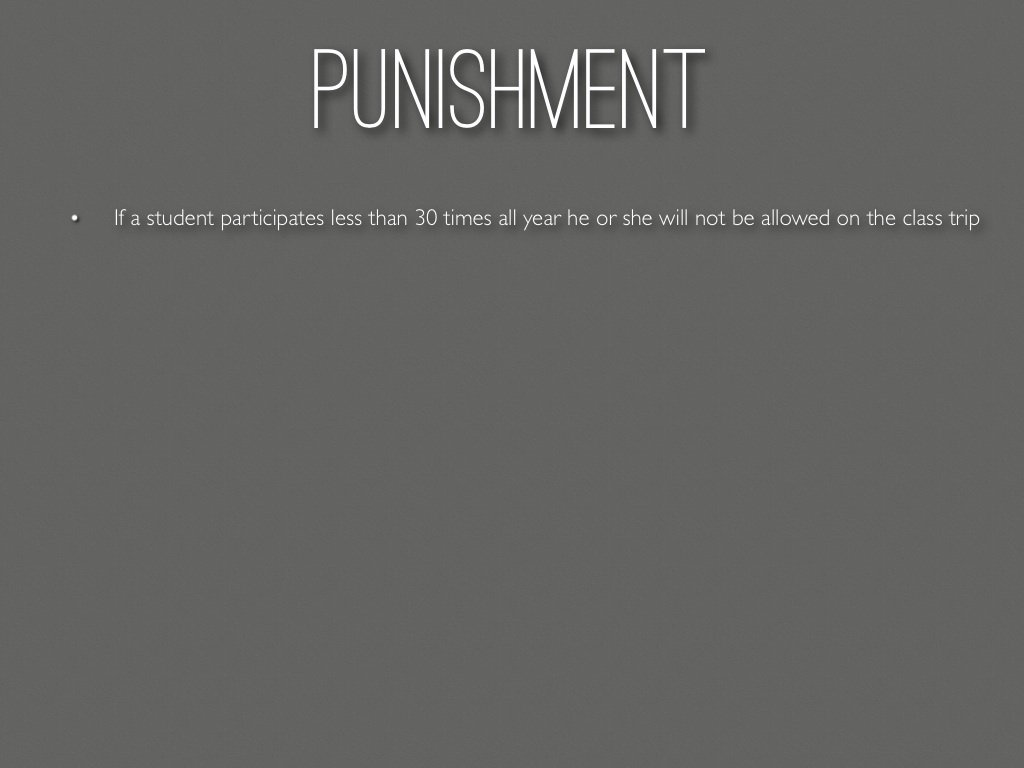 If a student participates less than 30 times all year he or she will not be allowed on the class trip