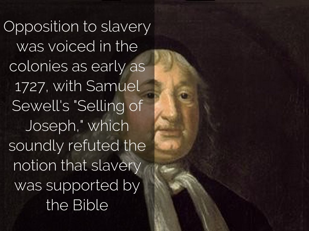 Opposition to slavery was voiced in the colonies as early as 1727, with Samuel Sewell's "Selling of Joseph," which soundly refuted the notion that slavery was supported by the Bible