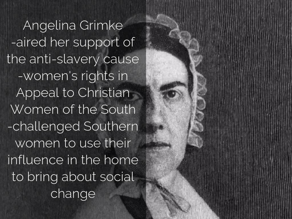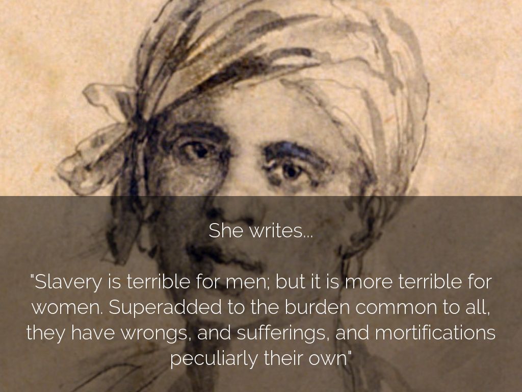 "Slavery is terrible for men; but it is more terrible for women. Superadded to the burden common to all, they have wrongs, and sufferings, and mortifications peculiarly their own"