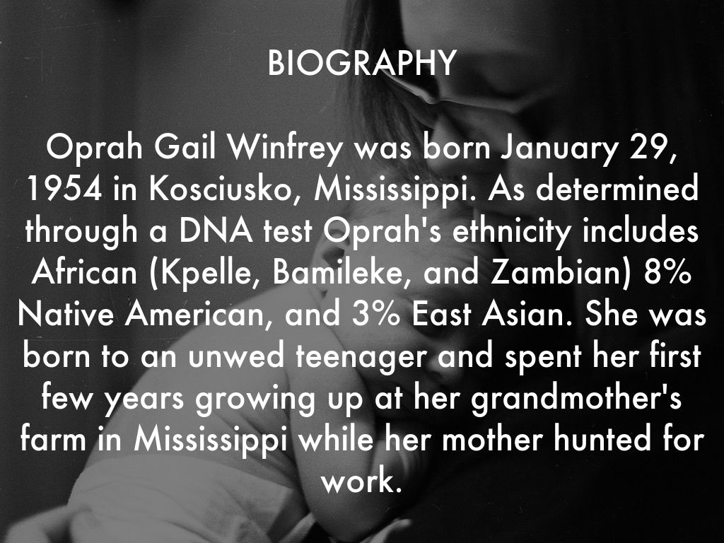 Oprah Gail Winfrey was born January 29, 1954 in Kosciusko, Mississippi. As determined through a DNA test Oprah's ethnicity includes African (Kpelle, Bamileke, and Zambian) 8% Native American, and 3% East Asian. She was born to an unwed teenager and spent her first few years growing up at her grandmother's farm in Mississippi while her mother hunted for work.