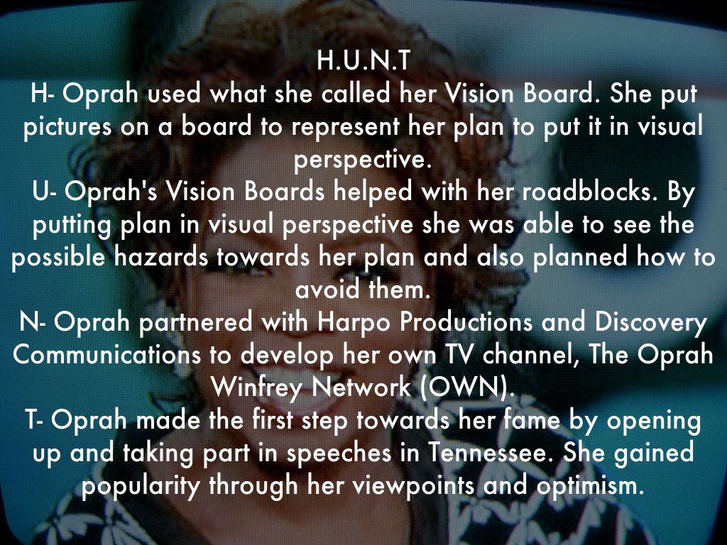 H.U.N.T H- Oprah used what she called her Vision Board. She put pictures on a board to represent her plan to put it in visual perspective. U- Oprah's Vision Boards helped with her roadblocks. By putting plan in visual perspective she was able to see the possible hazards towards her plan and also planned how to avoid them. N- Oprah partnered with Harpo Productions and Discovery Communications to develop her own TV channel, The Oprah Winfrey Network (OWN). T- Oprah made the first step towards her fame by opening up and taking part in speeches in Tennessee. She gained popularity through her viewpoints and optimism.