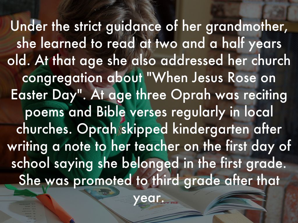 Under the strict guidance of her grandmother, she learned to read at two and a half years old. At that age she also addressed her church congregation about "When Jesus Rose on Easter Day". At age three Oprah was reciting poems and Bible verses regularly in local churches. Oprah skipped kindergarten after writing a note to her teacher on the first day of school saying she belonged in the first grade. She was promoted to third grade after that year.
