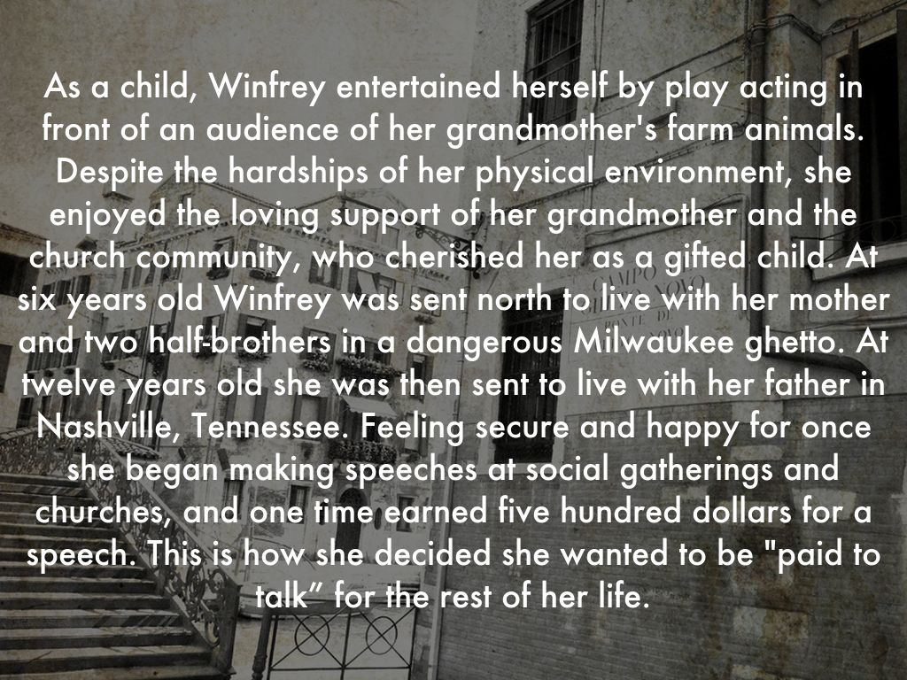 As a child, Winfrey entertained herself by play acting in front of an audience of her grandmother's farm animals. Despite the hardships of her physical environment, she enjoyed the loving support of her grandmother and the church community, who cherished her as a gifted child. At six years old Winfrey was sent north to live with her mother and two half-brothers in a dangerous Milwaukee ghetto. At twelve years old she was then sent to live with her father in Nashville, Tennessee. Feeling secure and happy for once she began making speeches at social gatherings and churches, and one time earned five hundred dollars for a speech. This is how she decided she wanted to be "paid to talk” for the rest of her life.