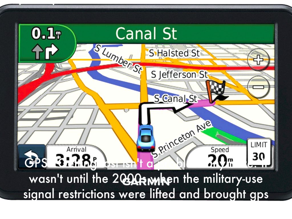 GPS - Getting lost isn't a problem anymore. It wasn't until the 2000s when the military-use signal restrictions were lifted and brought gps accuracy down to 20 meters.