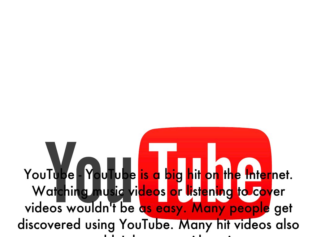 YouTube - YouTube is a big hit on the Internet. Watching music videos or listening to cover videos wouldn't be as easy. Many people get discovered using YouTube. Many hit videos also wouldn't be seen without it.