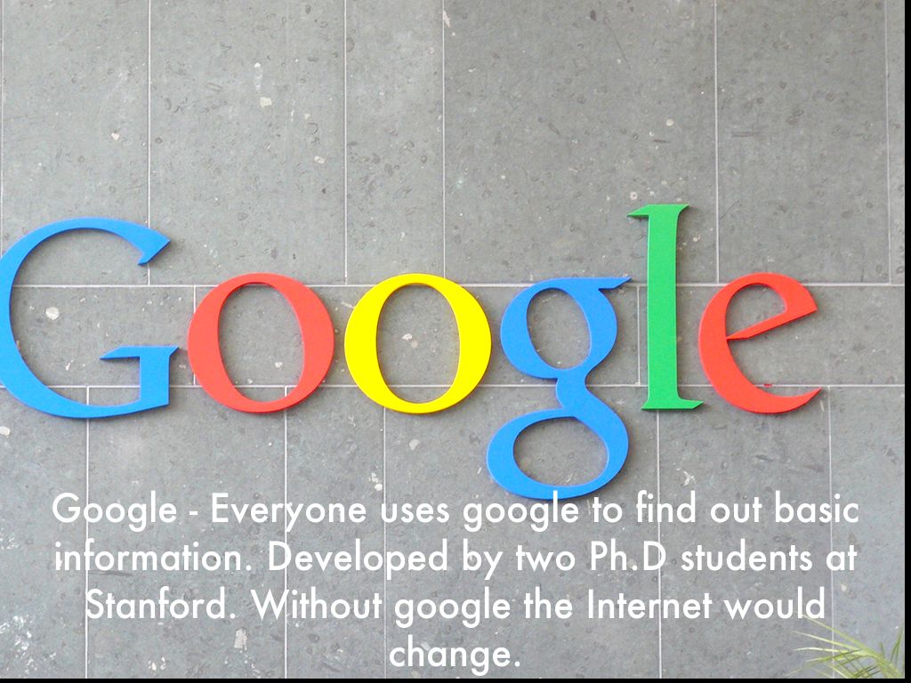 Google - Everyone uses google to find out basic information. Developed by two Ph.D students at Stanford. Without google the Internet would change.