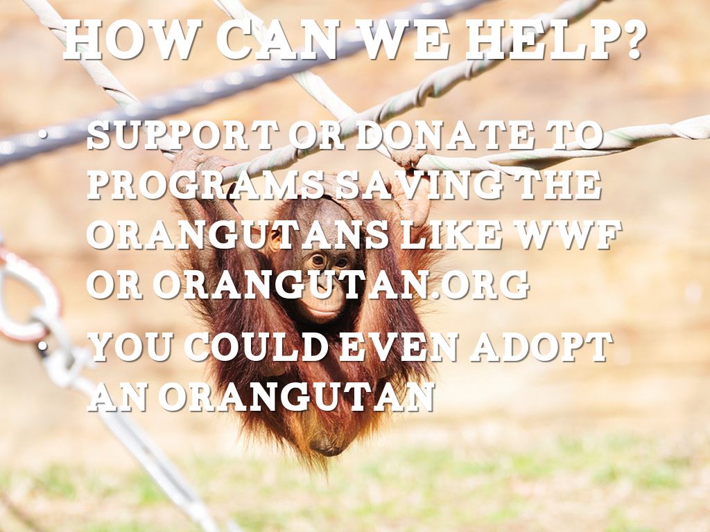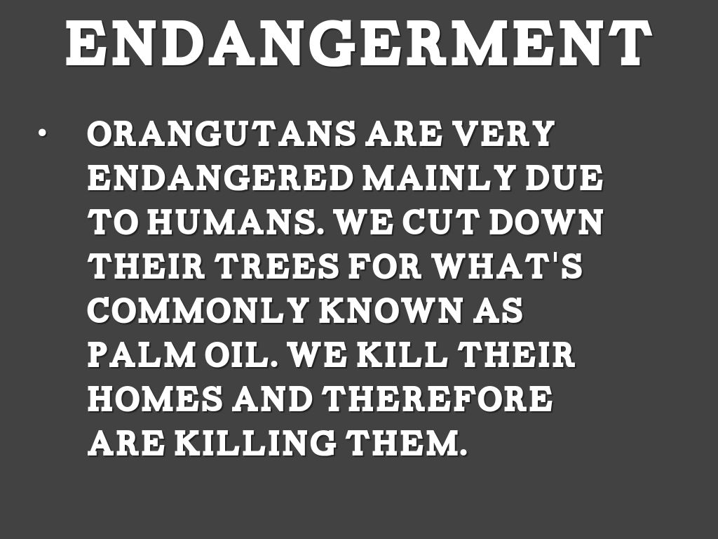 Orangutans are very endangered mainly due to humans. We cut down their trees for what's commonly known as Palm oil. We kill their homes and therefore are killing them.