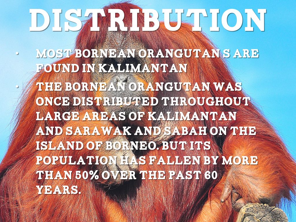 The Bornean orangutan was once distributed throughout large areas of Kalimantan and Sarawak and Sabah on the island of Borneo. But its population has fallen by more than 50% over the past 60 years.