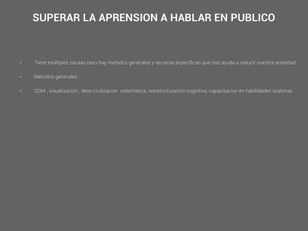 • Tiene multiples causas pero hay metodos generales y tecnicas especificas que nos ayuda a reducir nuestra ansiedad y manejar nuestro nerviosismo