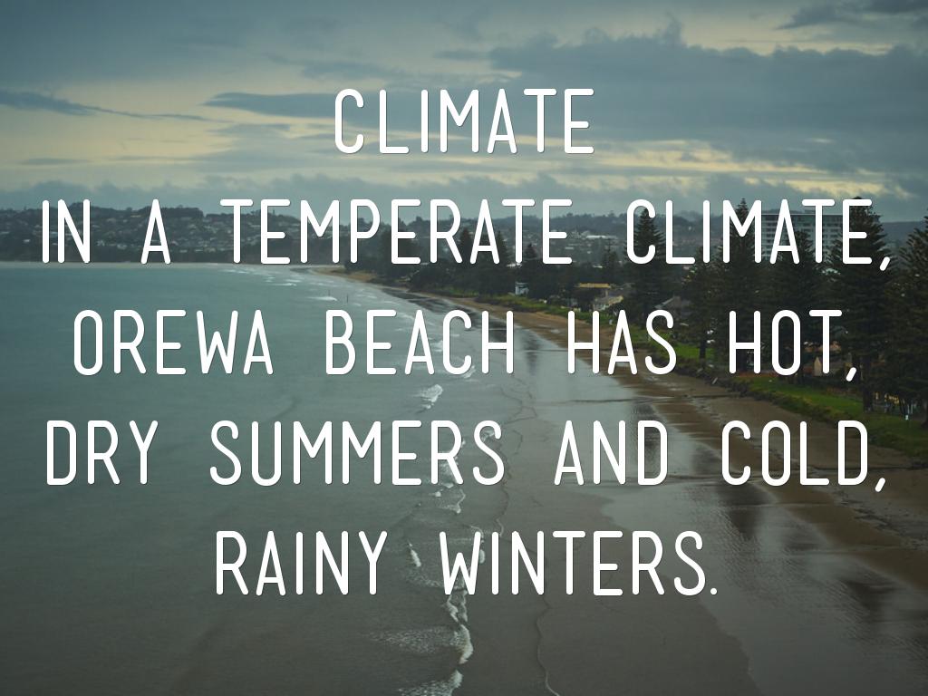 In a temperate climate, Orewa Beach has hot, dry summers and cold, rainy winters.