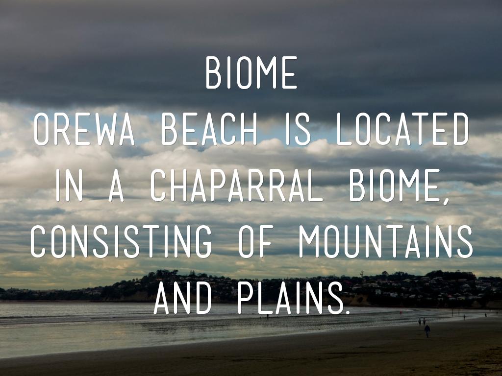 Orewa Beach is located in a chaparral biome, consisting of mountains and plains.