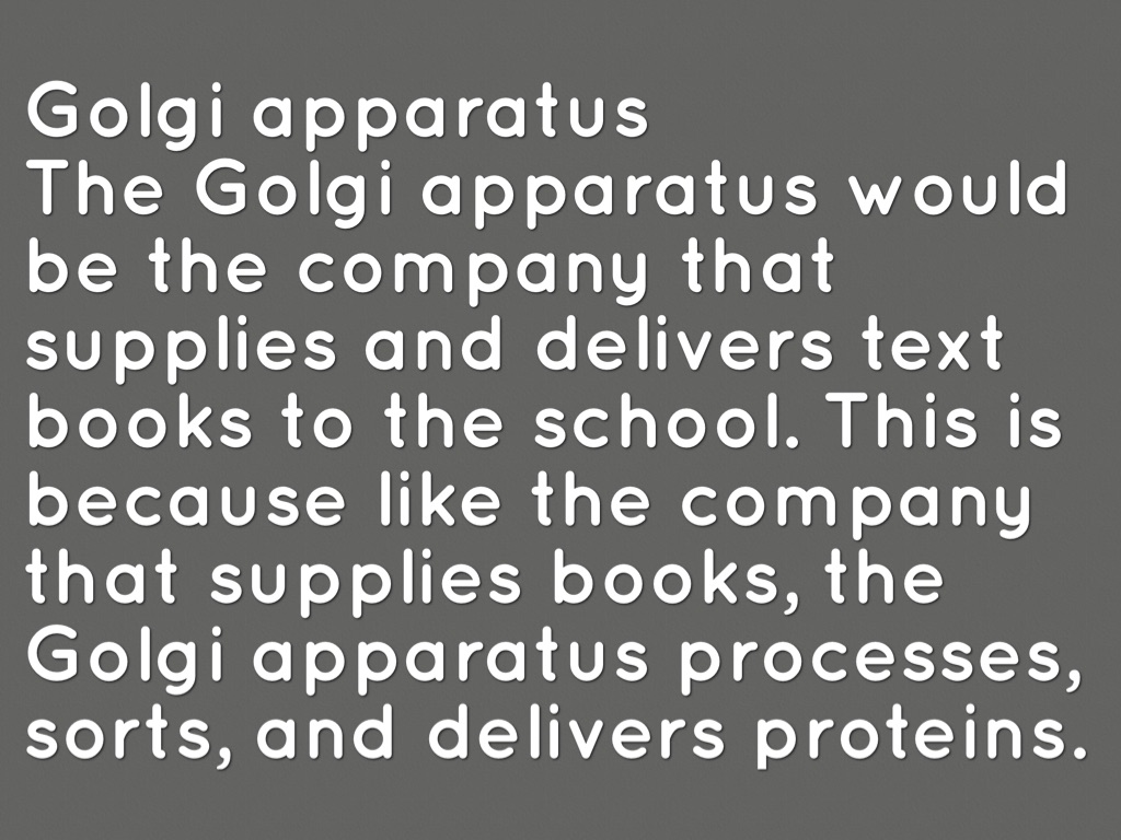 The Golgi apparatus would be the company that supplies and delivers text books to the school. This is because like the company that supplies books, the Golgi apparatus processes, sorts, and delivers proteins.