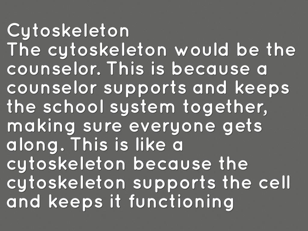 The cytoskeleton would be the counselor. This is because a counselor supports and keeps the school system together, making sure everyone gets along. This is like a cytoskeleton because the cytoskeleton supports the cell and keeps it functioning