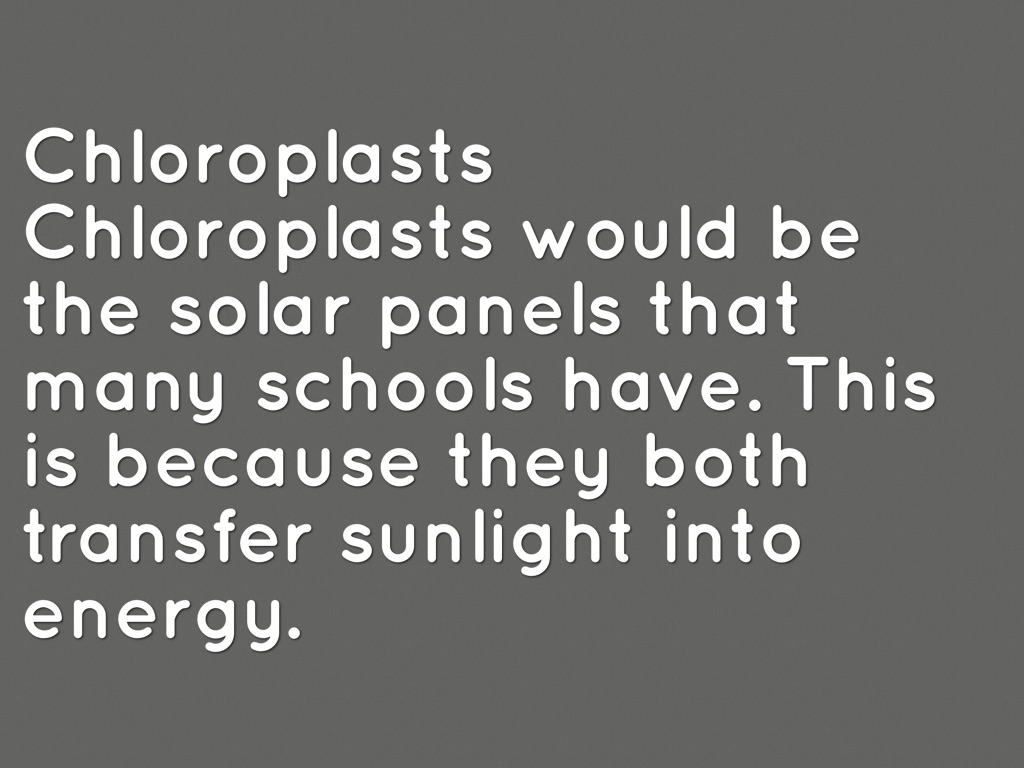 Chloroplasts would be the solar panels that many schools have. This is because they both transfer sunlight into energy.
