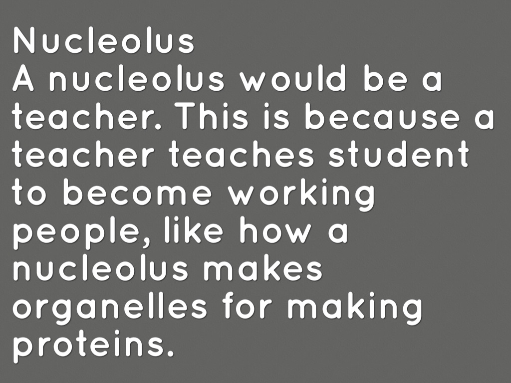 A nucleolus would be a teacher. This is because a teacher teaches student to become working people, like how a nucleolus makes organelles for making proteins.