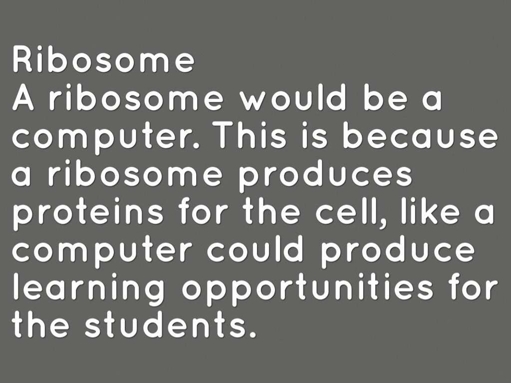 A ribosome would be a computer. This is because a ribosome produces proteins for the cell, like a computer could produce learning opportunities for the students.