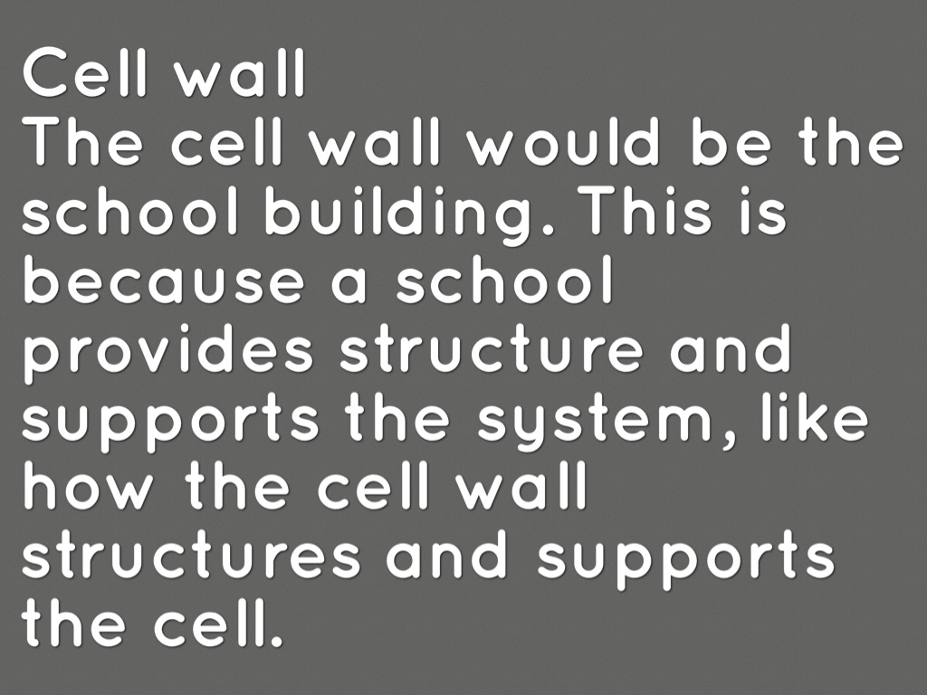 The cell wall would be the school building. This is because a school provides structure and supports the system, like how the cell wall structures and supports the cell.