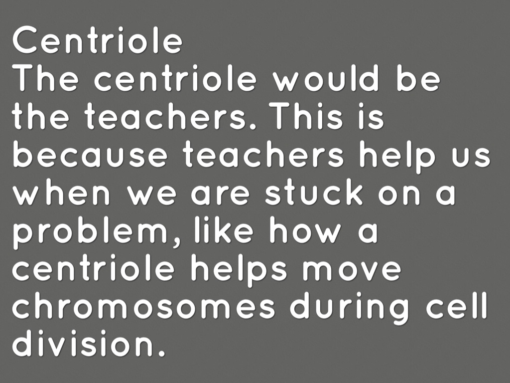 The centriole would be the teachers. This is because teachers help us when we are stuck on a problem, like how a centriole helps move chromosomes during cell division.